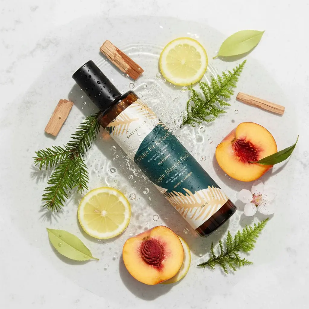 La bruine d'ambiance Sapin Blanc et Pêche est un vaporisateur botanique concentré qui fusionne la clarté vive des forêts de conifères avec la chaleur veloutée des fruits à noyau mûrs. Sa composition aromatique se déploie en strates : aiguilles résineuses tranchantes adoucies par la pêche miellée, ancrées dans un baume balsamique et des murmures floraux sylvestres. La finale persiste sur des accords de cèdre et de musc, créant une atmosphère multidimensionnelle à la fois enracinante et vivifiante.