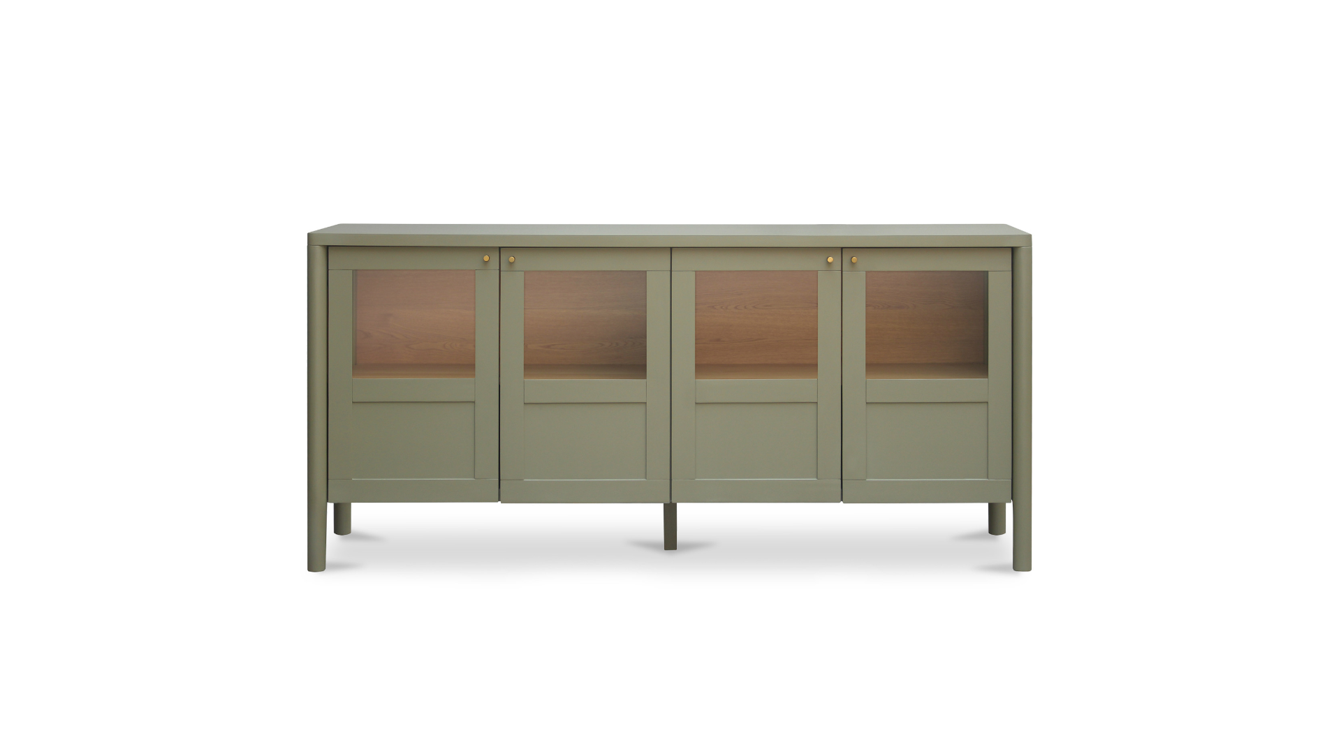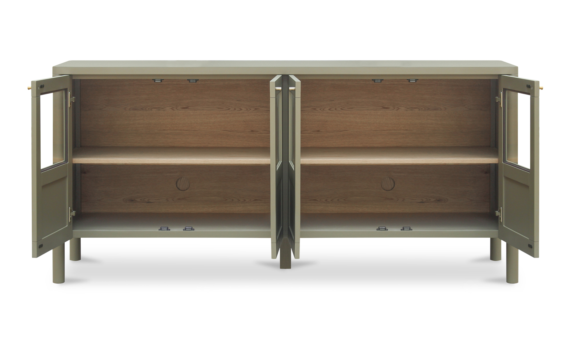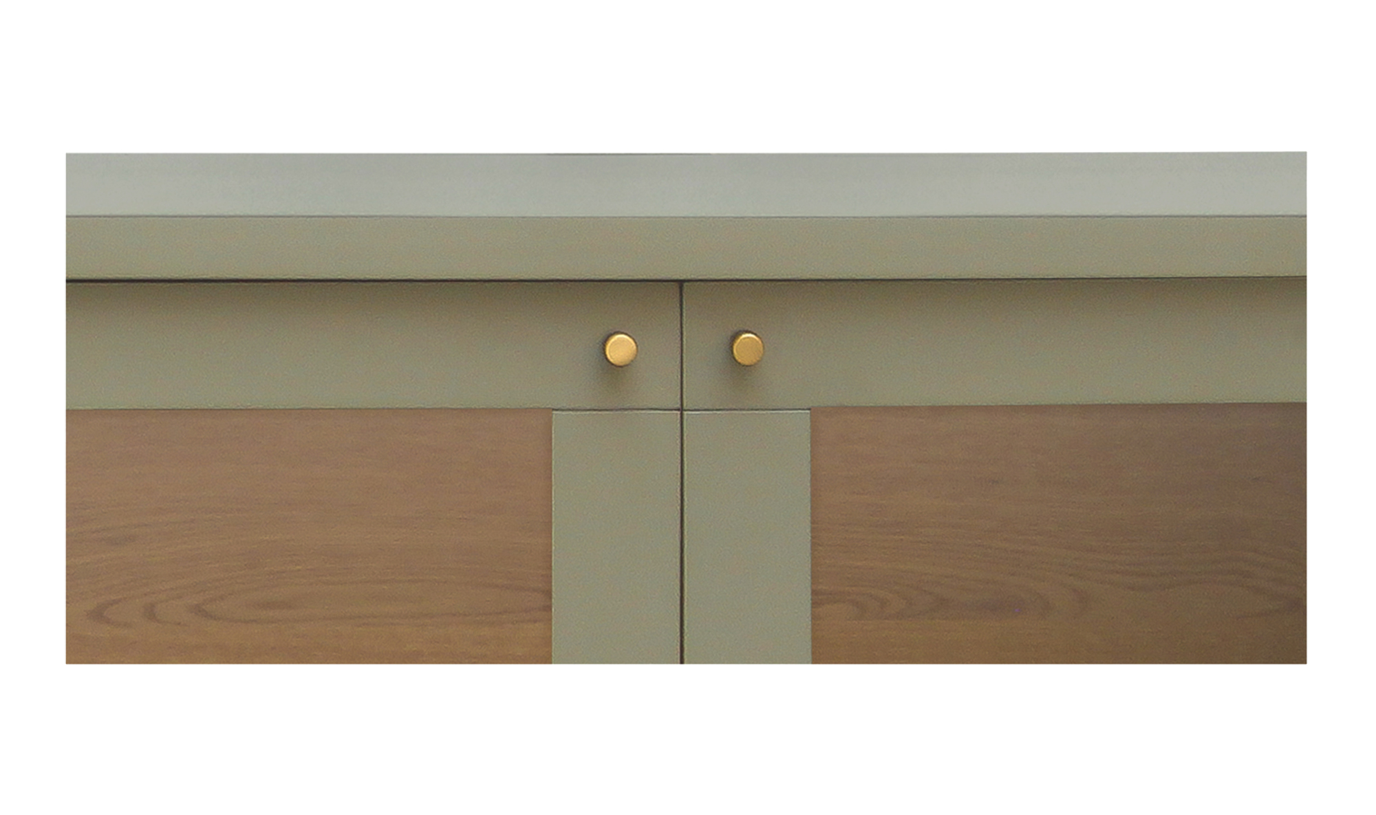 Les panneaux avant de porte sont un équilibre entre rangement transparent et dissimulé. Les pieds à chevilles et la quincaillerie en bronze simple ajoutent de la douceur