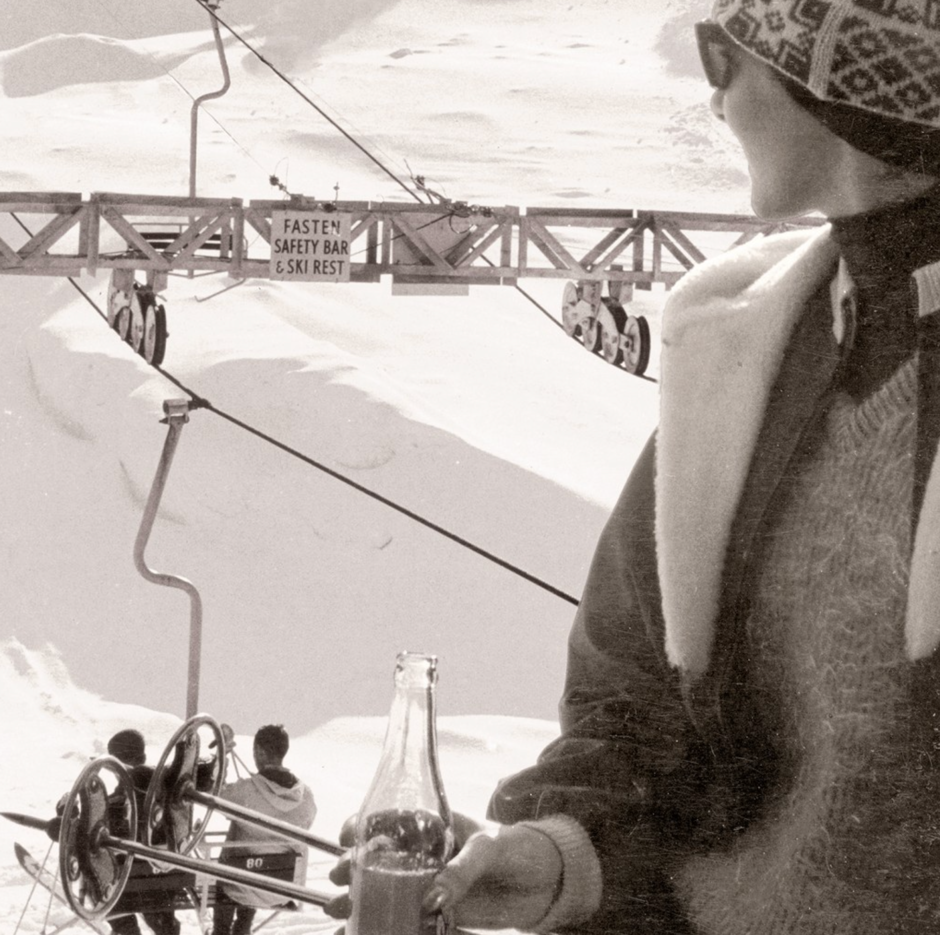 Cette photographie d'époque immortalise deux skieurs savourant leurs boissons, le regard tourné vers le télésiège et les montagnes au loin, depuis le chalet.