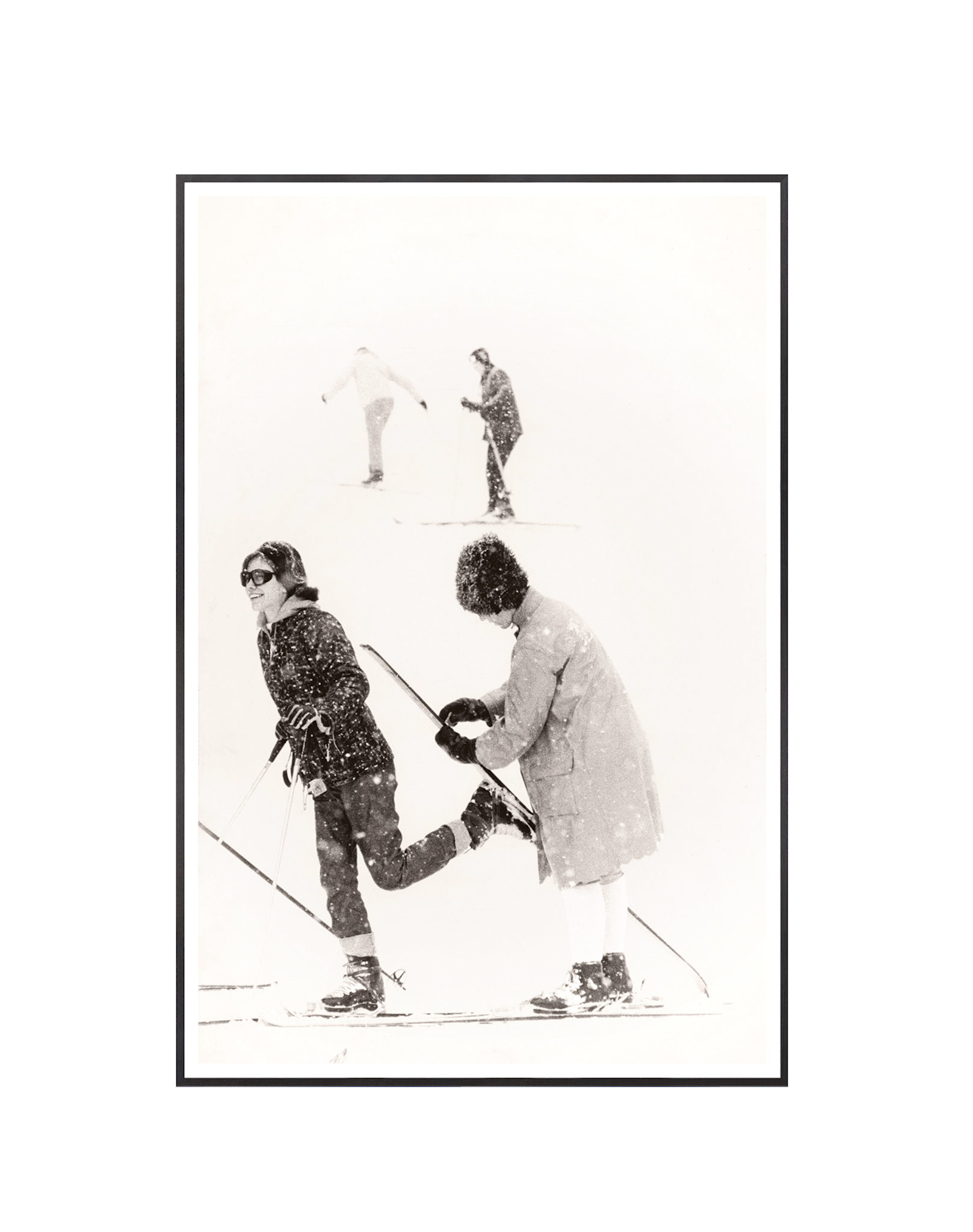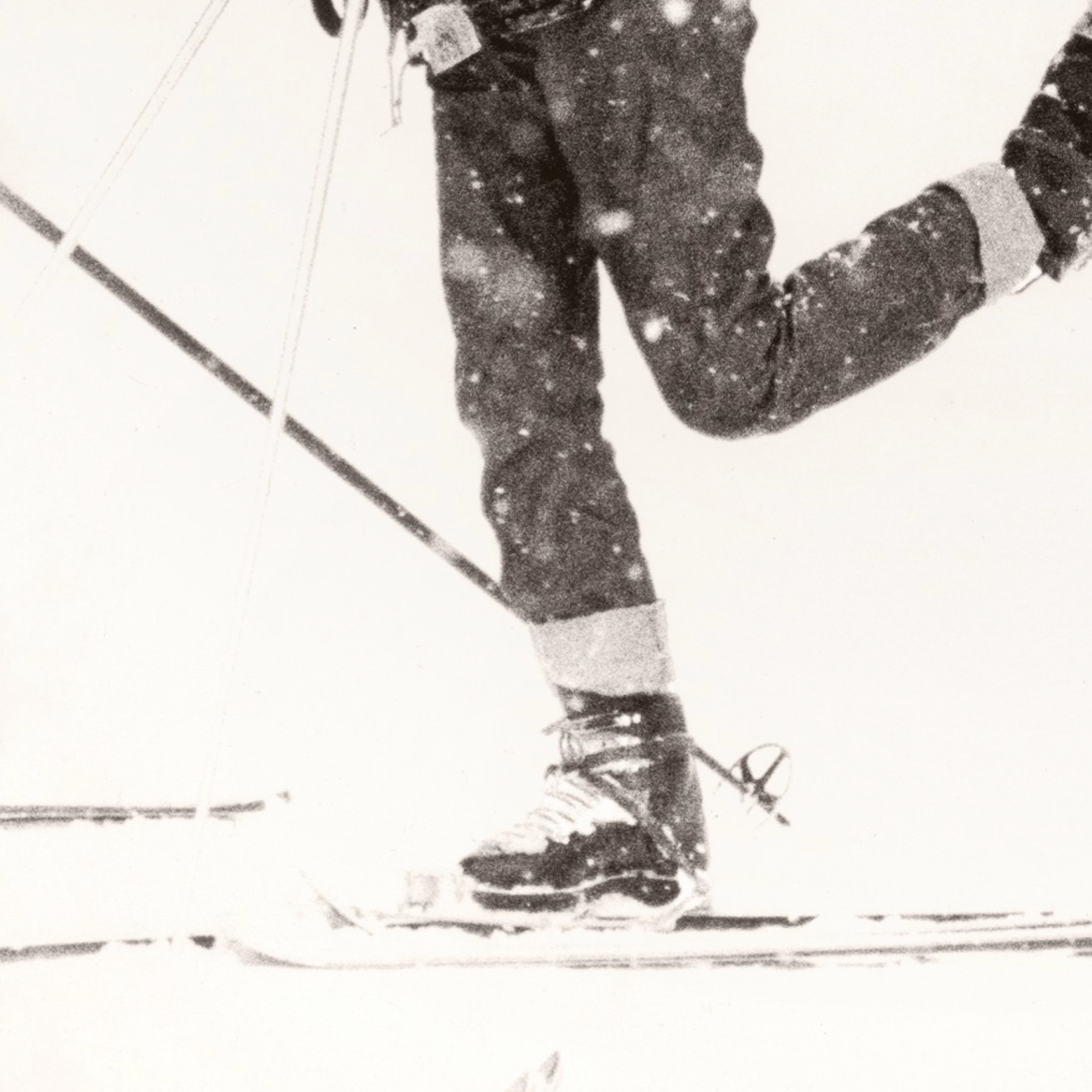 S'inscrireCette photographie d'époque immortalise une femme riant avec une amie, tandis qu'on farte ses skis sous une douce neige qui la recouvre, ainsi que d'autres skieurs, sur les pistes.