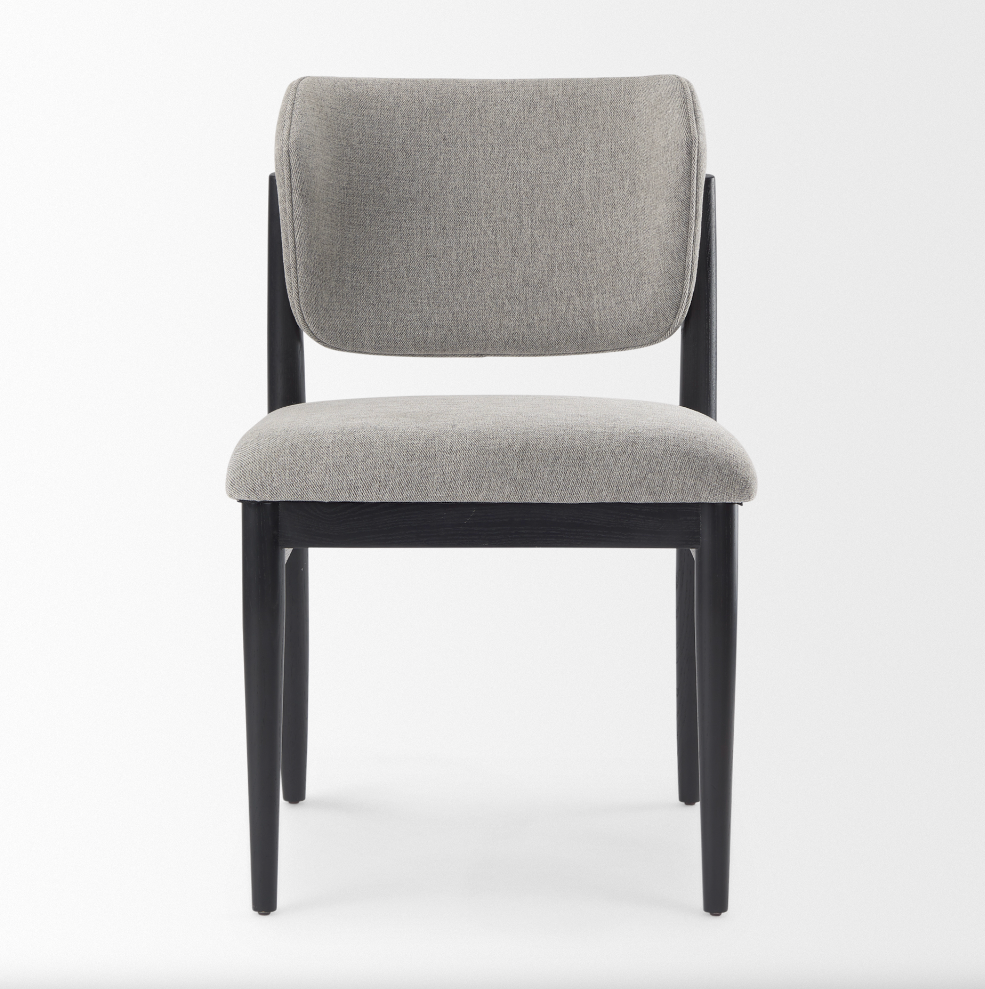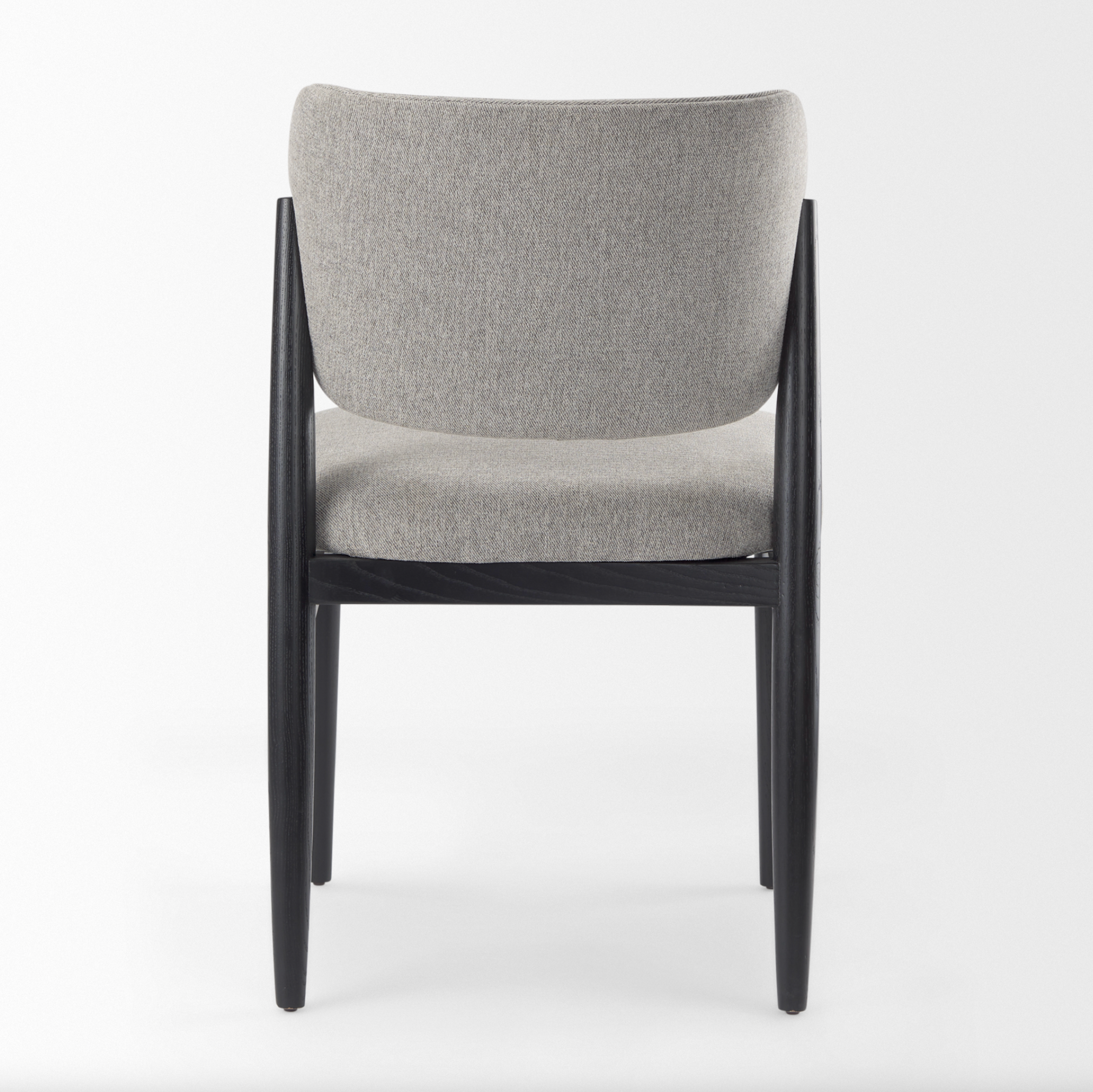 Son dossier incurvé et son assise rembourrée sont revêtus d'un tissu gris lisse, tandis que ses pieds en bois massif teinté noir apportent un contraste saisissant et une touche architecturale. Sa forme à la fois ancrée et aérienne confère une élégance discrète et moderne à tout espace repas.