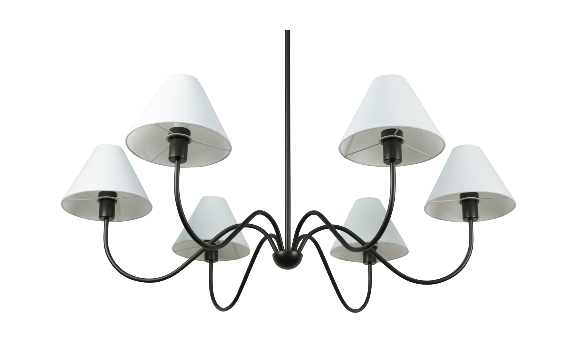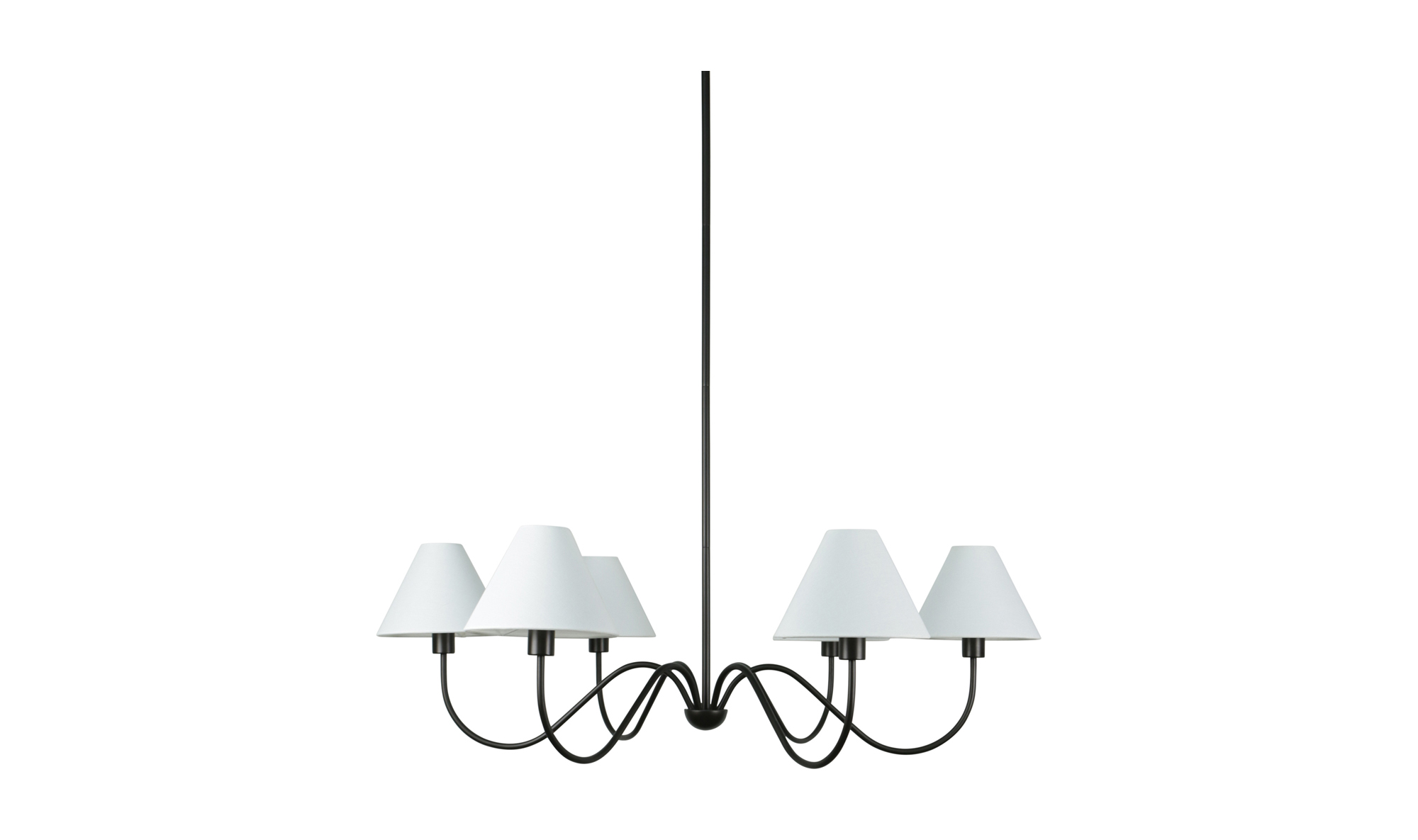 S'inscrireSix lumières, nichées dans des abat-jours en mélange de lin, projettent une lueur chaleureuse, équilibrant le blanc éclatant et le métal foncé.