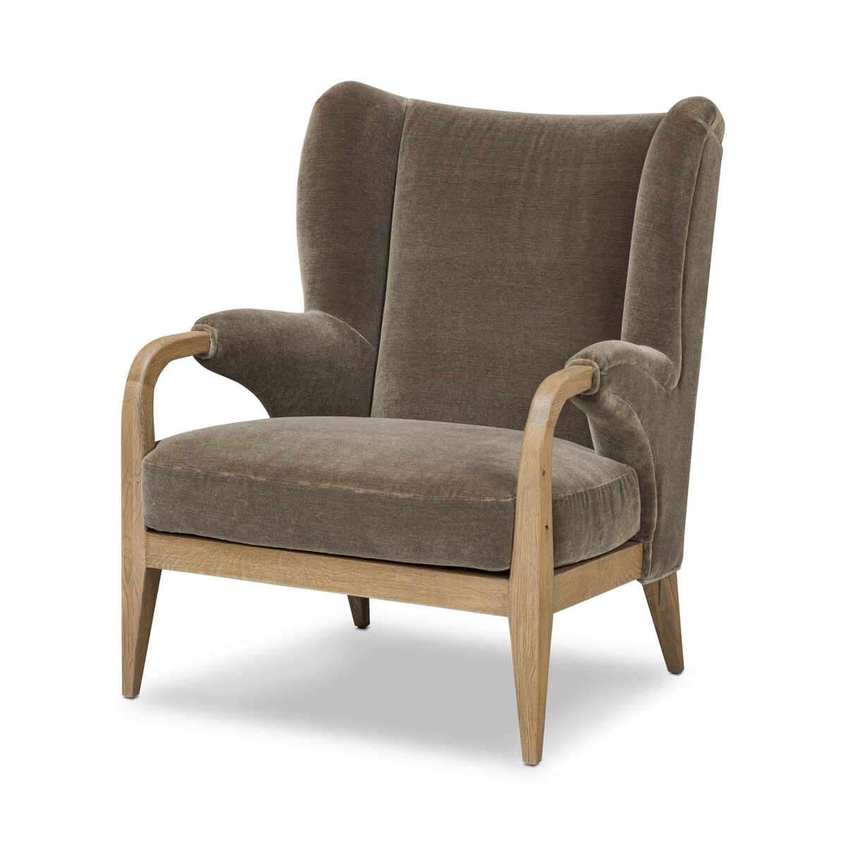 La simplicité des lignes de ce fauteuil met en valeur des détails subtils, notamment une structure en chêne massif soigneusement conçue qui semble se prolonger à mi-hauteur des accoudoirs rembourrés avant de rejoindre harmonieusement les pieds. Le revêtement en imitation mohair apporte une touche d'élégance à cette structure traditionnelle.