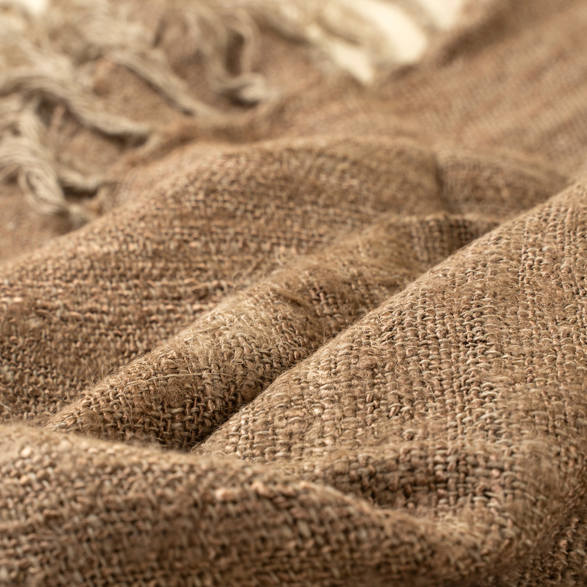 - Tissage naturel en lin mélangé avec une texture irrégulière visible et une brillance soyeuse luxueuse