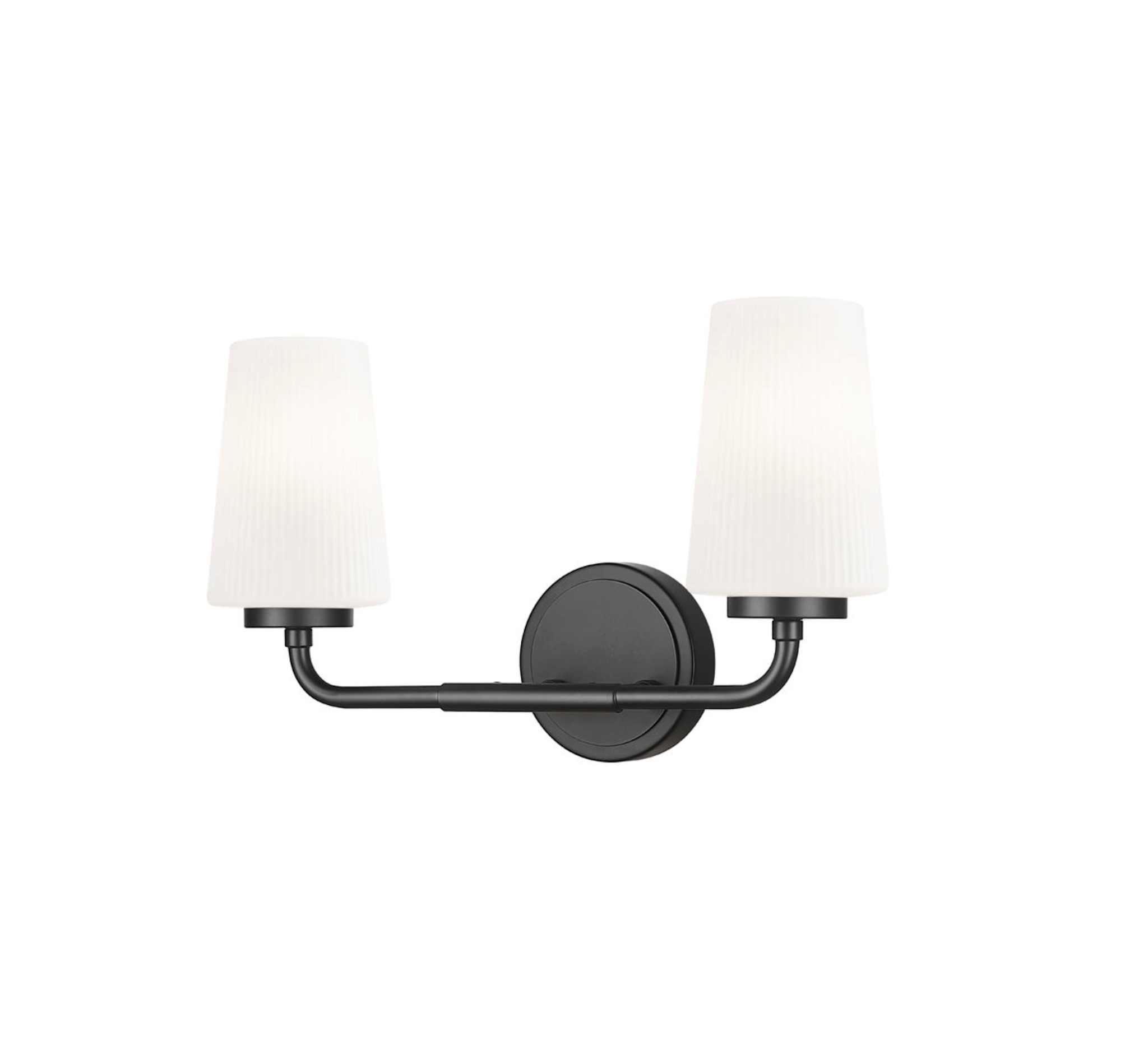 Les abat-jour délicats en verre opale strié et fuselé créent une silhouette saisissante pour cette applique murale moderne à deux lumières.