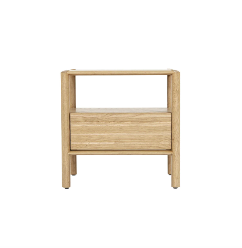 Une table de chevet compacte offrant un tiroir et une étagère ouverte dans une élégante finition chêne – idéale pour les objets essentiels à portée de main.