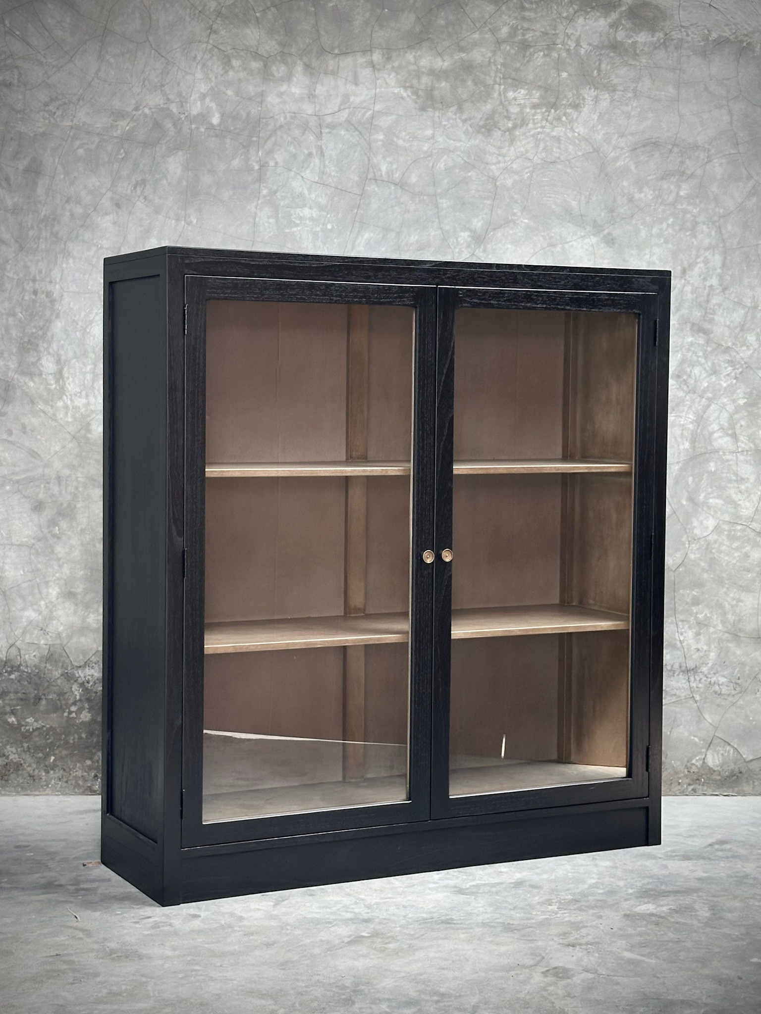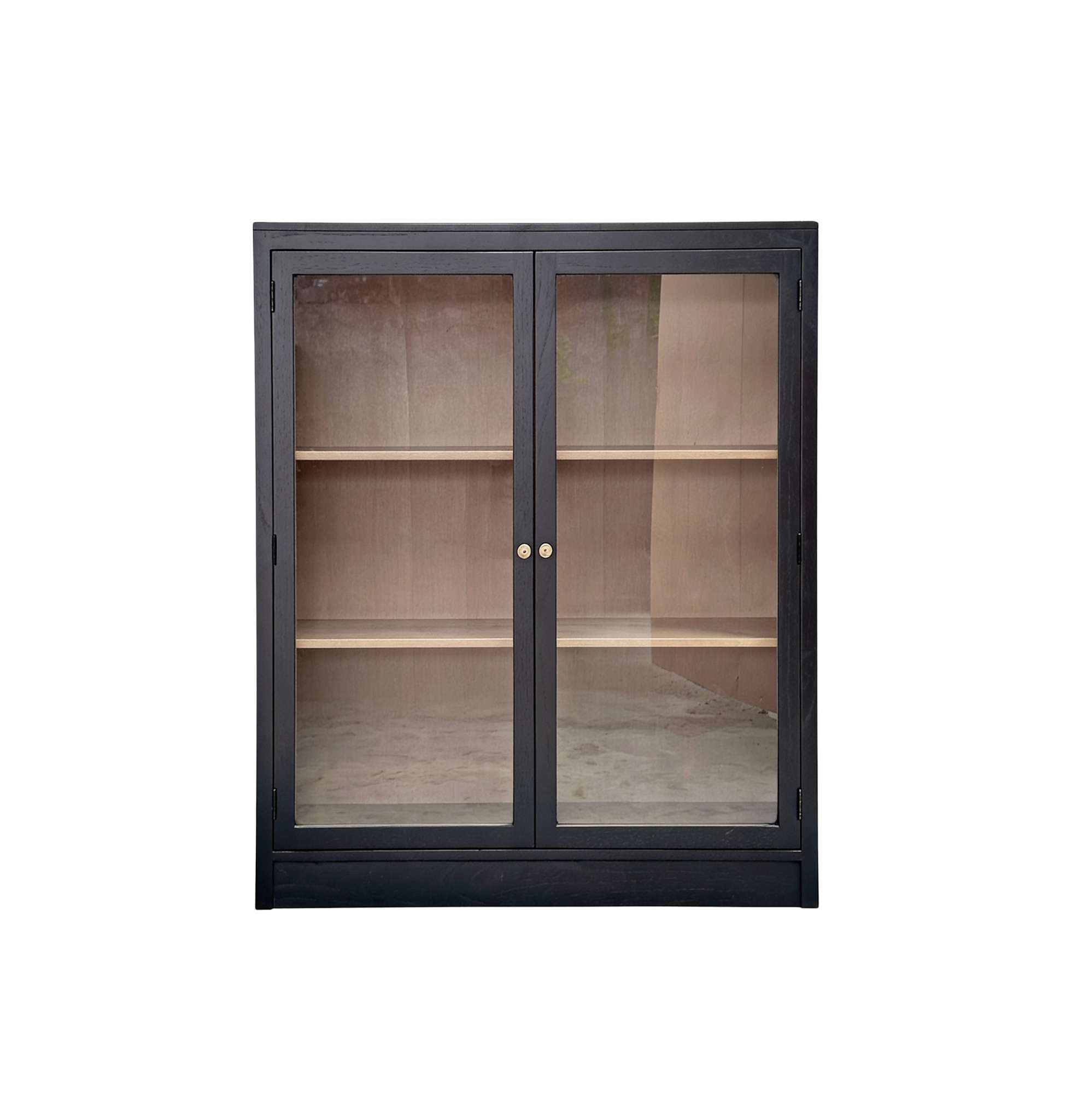 The Fraser Cabinet is an elegant and versatile storage piece, crafted from solid mindi wood and finished with glass-front doors framed in a deep black tone. Its clean-lined design highlights the natural beauty of the wood while offering a refined display for tableware, decorative objects, or books.