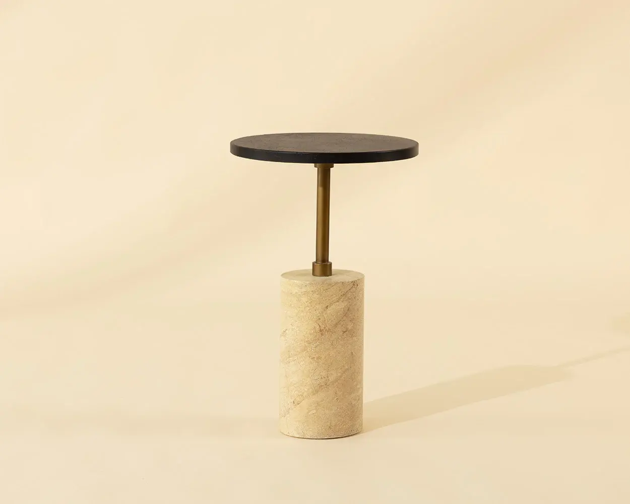 The Saldo End Table draws the eye with its bold geometry. A cylindrical concrete base in a travertine finish sets a natural foundation, while above, a round black pitted concrete top adds a striking graphic edge.