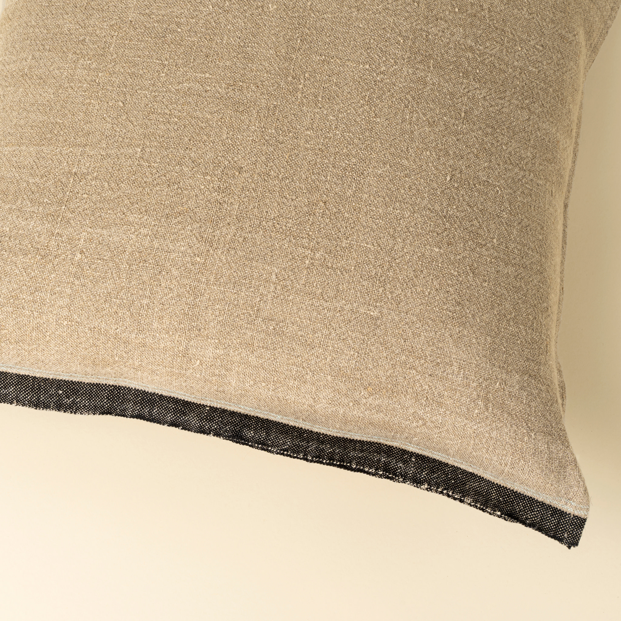 Create an accountMade from thick, 100% Belgian linen in an un-dyed natural hue, this decorative throw pillow features a woven stripe detail and raw selvage edges in deep charcoal down two sides. It's a timeless choice for those who appreciate quality materials and subtle design in their decor pillows.